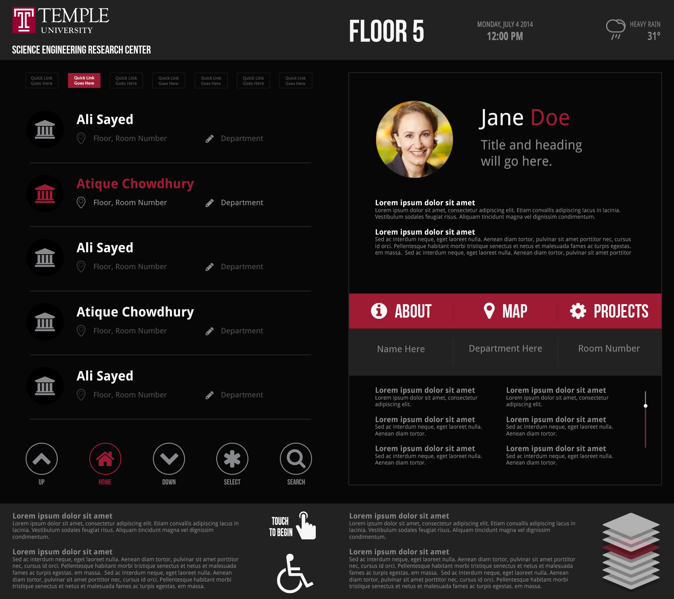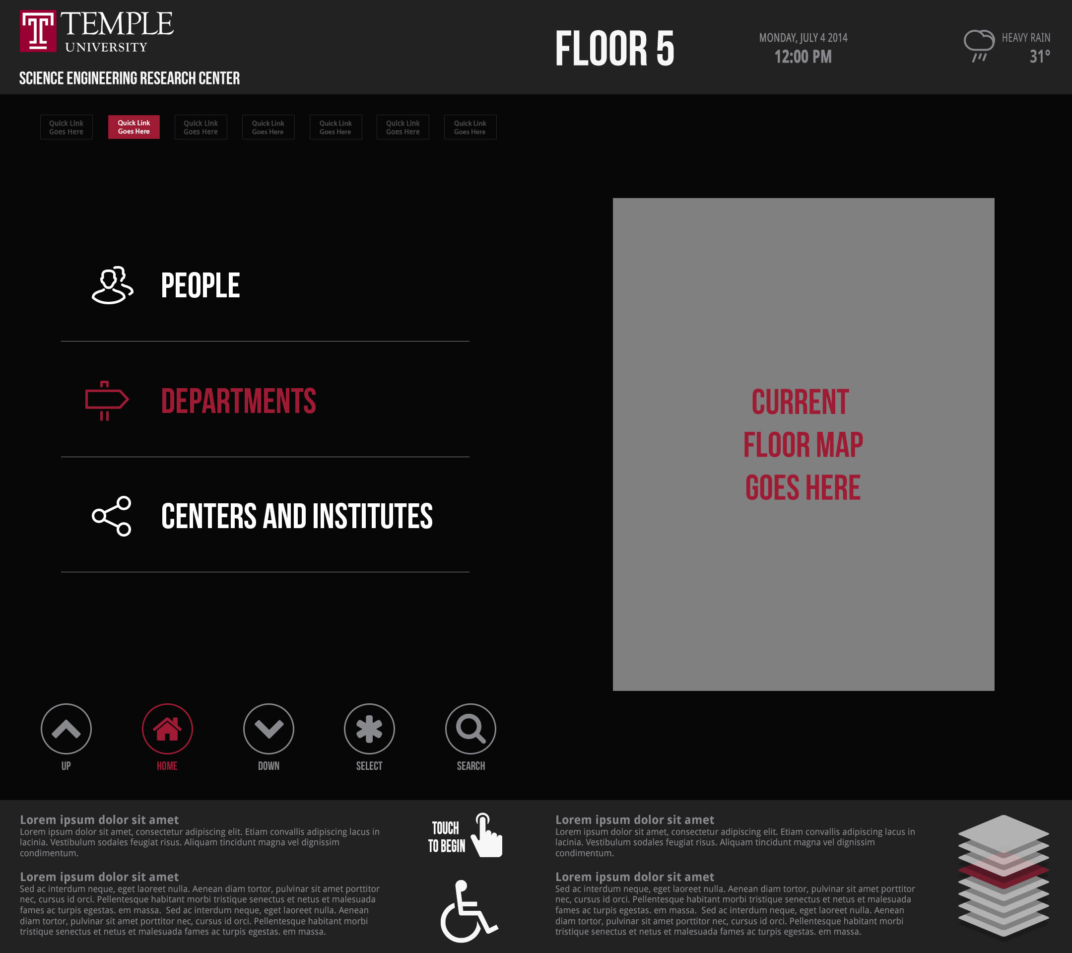 Interactive wayfinding is a versatile application that provides more than just directions. Wayfinding not only provides line and text directions from building to building, but will also provide indoor directions to departments and class rooms. Wayfinding is also developed to be 508 and ADA compliant. Handicapped students and visitors have access to wheelchair accessible only directions, kiosks that are easily physically adjustable and software that speaks to help the auditory impaired.