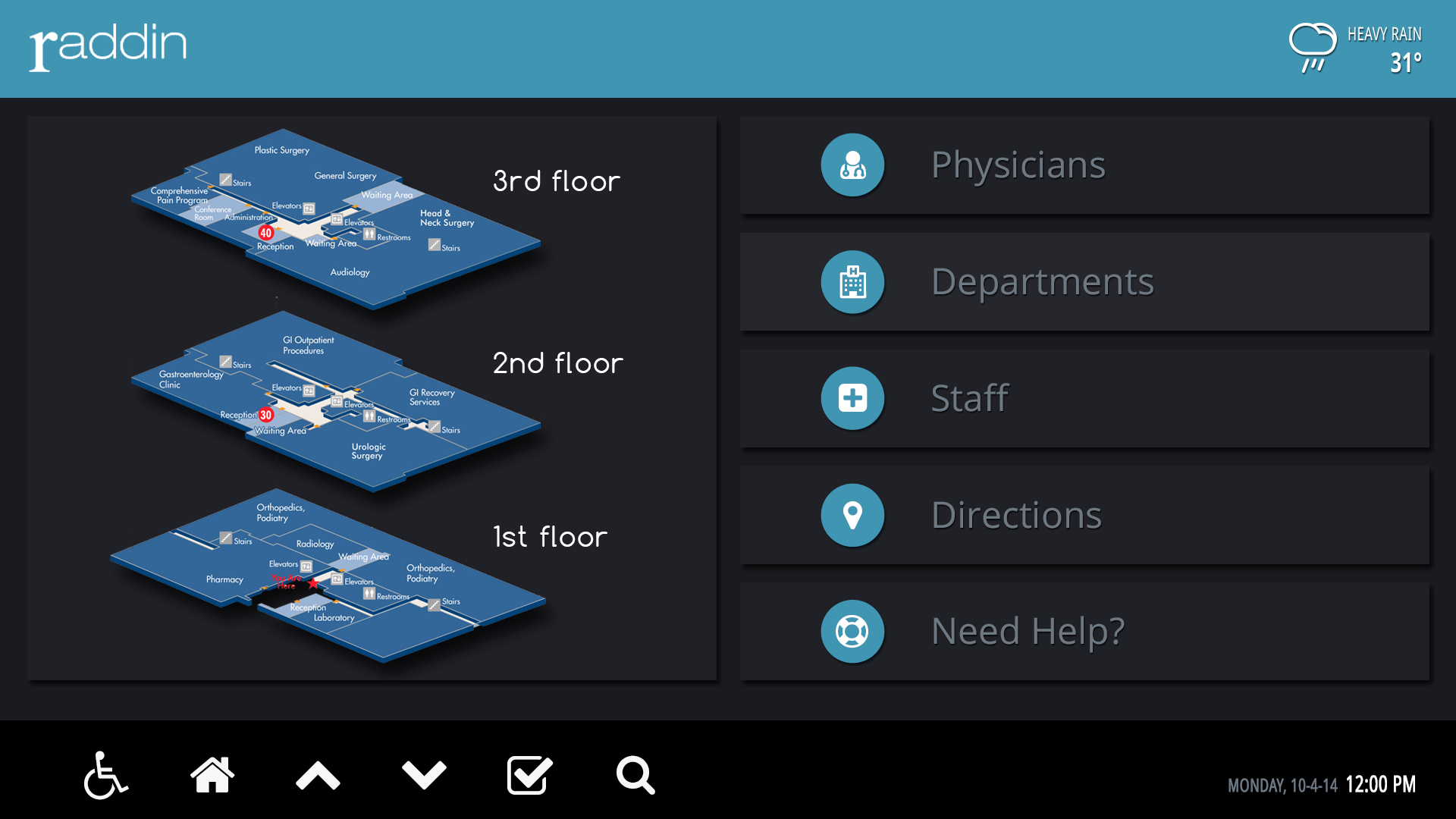 Wayfinding can also be used as an emergency alert system, a department and staff directory, an event calendar and announcement system. The app is also available in various languages.