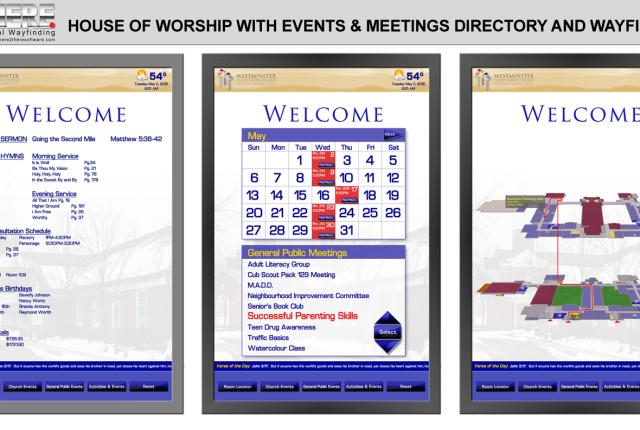 The events and meeting calendar app can be added to Here2There wayfinding and is completely interactive. Can be set for public use, or only accessible by staff.
